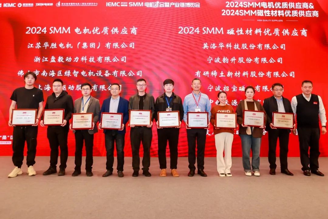 12月4日-5日,由国家精密微特电机工程技术研究中心、上海有色网信息科技股份有限公司等单位联合主办的IEMC 2024 SMM(第四届)电机年会暨产业链博览会在浙江宁波举行,期间,举办了优质供应商颁奖仪式。有研稀土获评“2024SMM磁性材料优质供应商”。浙江省电机行业协会副秘书长陆柏生为获奖企业颁奖。